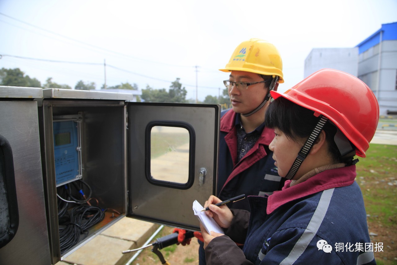 / 近日,新橋礦業公司技改擴建后的污水處理新系統明渠流量計柜前,兩名員工正在觀察記錄外排水流量。